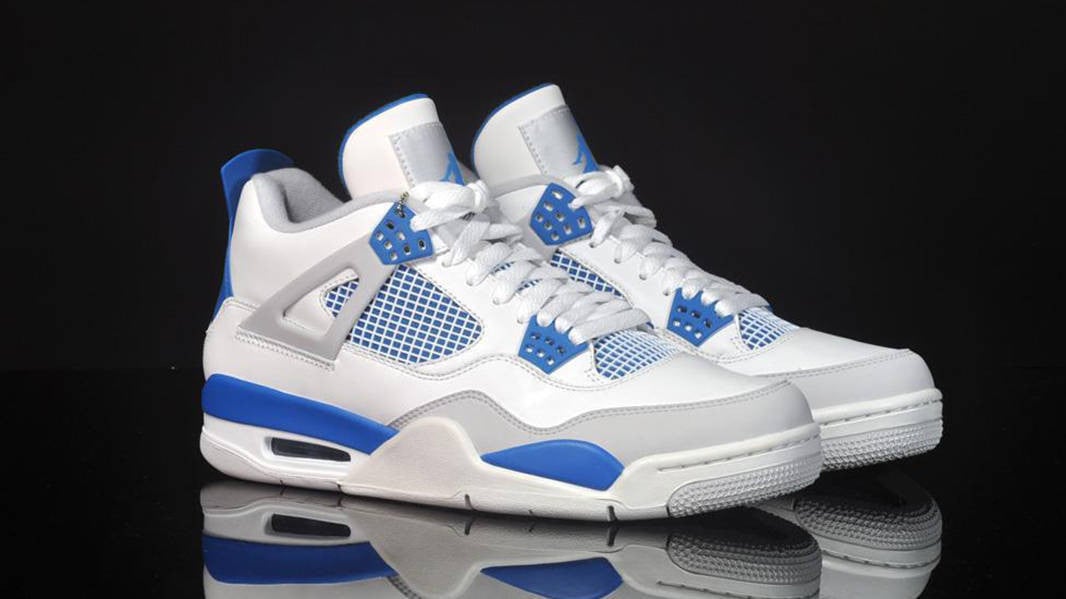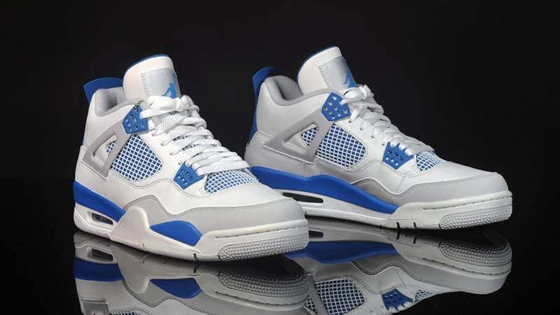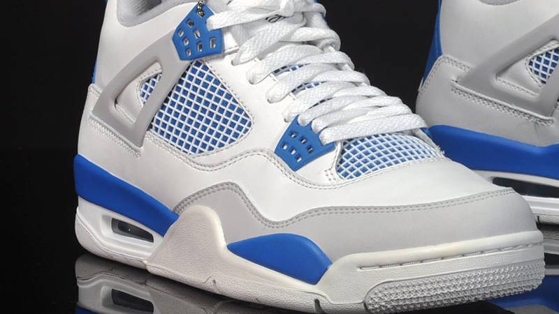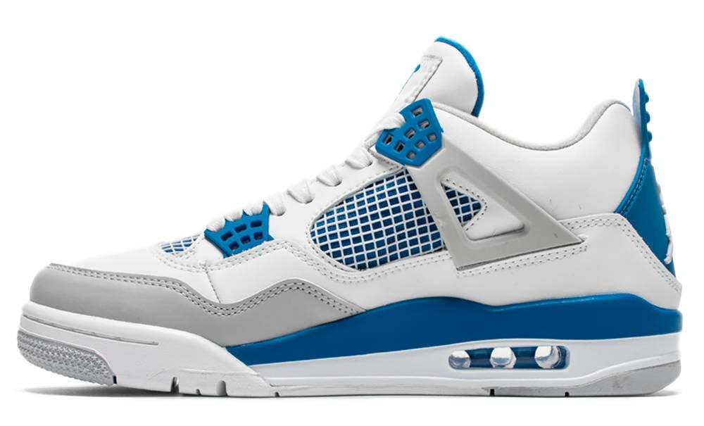 The Nike Air Jordan 4 Retro Military Blue 2012 is based on the 1989 Off-White/Military Blue OG colorway. The design combines a white leather upper with Military Blue and Natural Grey accents. Released in August 2012, the sneaker also features Jumpman branding at the tongue and heel.